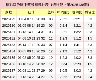 红球三区比1:2:3,质合比为2:4,012路比为2:2:2,蓝球为合数、0路号码。