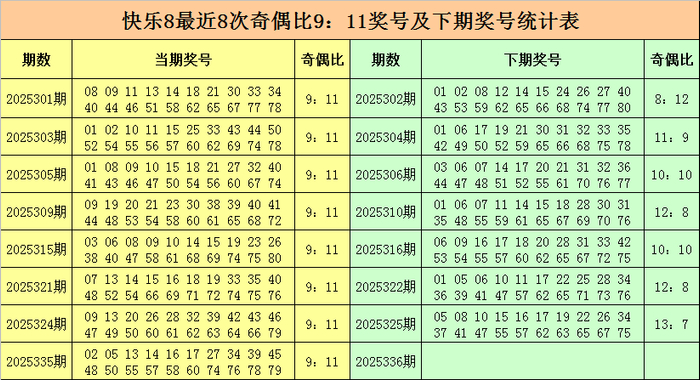 福彩昂然8第2025335期开奖转头:02 05 13 14 16 17 27 34 39 45 48 50 55 57 58 60 74 76 78 79,其中奖号奇偶比为9:11,大小比为11:9,012路比为7:7:6。